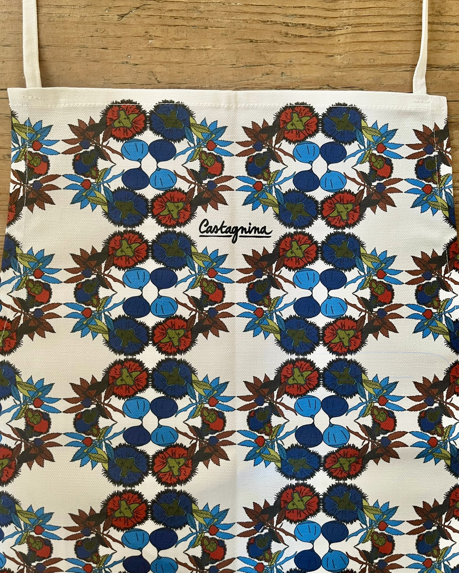 Machine-proof super organic oeko-tex cotton, piquant prints, an extract of the Lamentu di u Castagnu on the reverse and a perfect fit: a classa in cucina...